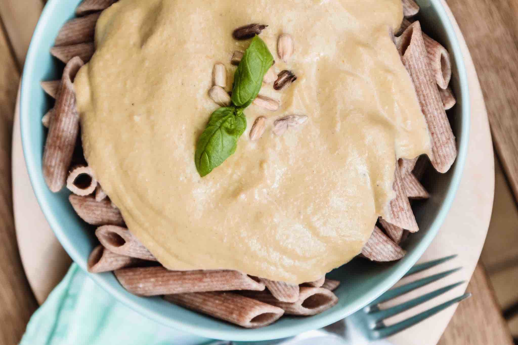 Für die vegane Käsesauce zunächst die Sonnenblumenkerne am Abend zuvor in Wasser einweichen. Wenn du einen